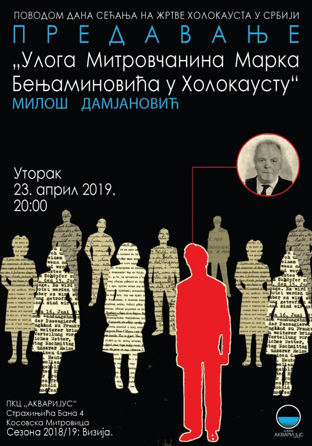 Povodom 22. aprila - Dana sećanja na žrtve Holokausta u Srbiji, istoričar iz Kosovske Mitrovice, Miloš Damjanović održao je javno predavanje ,,Uloga Mitrovčanina Marka Benjaminovića u Holokaustu“, 23. aprila 2019. u Kulturnom centru ,,Akvarijus“ u Kosovskoj Mitrovici.