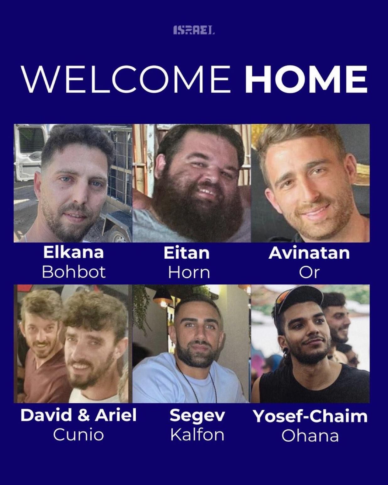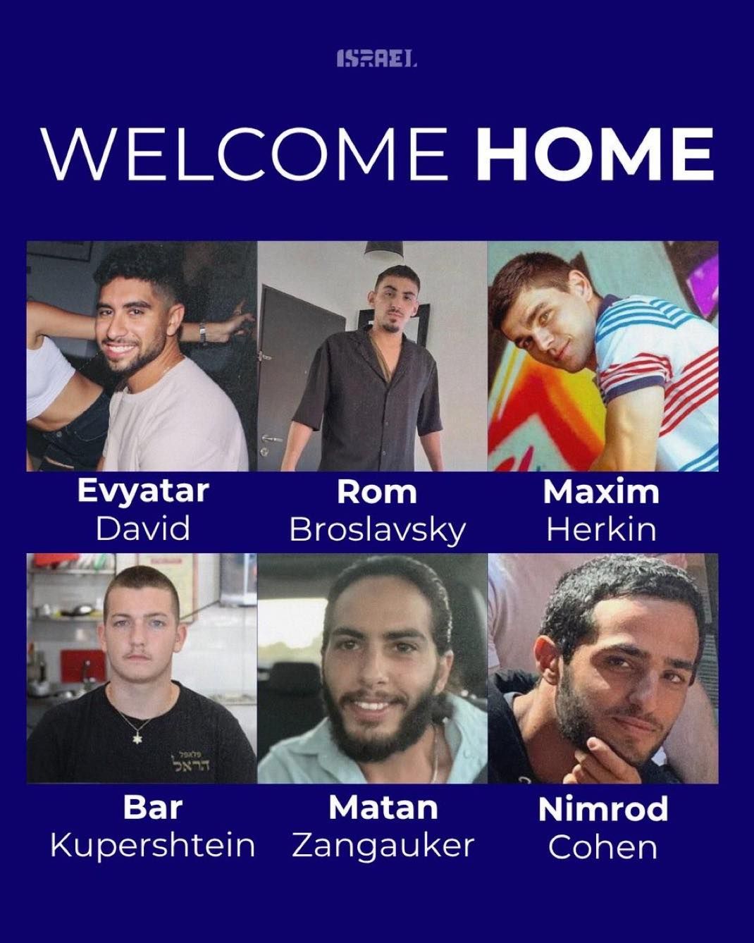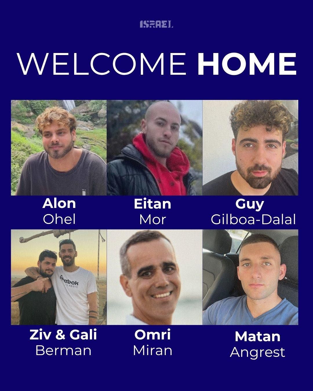 Prvih sedam živih talaca - Matan Angrest, Alon Ohel, Omri Miran, Eitan Mor, Guy Gilboa-Dallal i blizanci Gali i Ziv Berman oslobođeni su u ponedeljak u 8 ujutru. Sledećih 13 - Elkana Bohbot, Avinatan Or, Yosef-Haim Ohana, Evyatar David, Rom Braslavski, Segev Kalfon, Nimrod Cohen, Maxim Herkin, Eitan Horn, Matan Zangauker, Bar Kupershtein i braća David i Ariel Cunio oslobođeni su istog dana oko 11 časova.